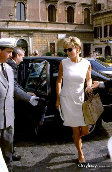 A princesa Diana também é uma das famosas fãs da bolsa de bambu Guccio, a foto foi tirada em Roma em 1991. Um vestido Chanel branco puro com a mesma bolsa de bambu nobre, esta é a imagem mais bonita em nossos corações.
