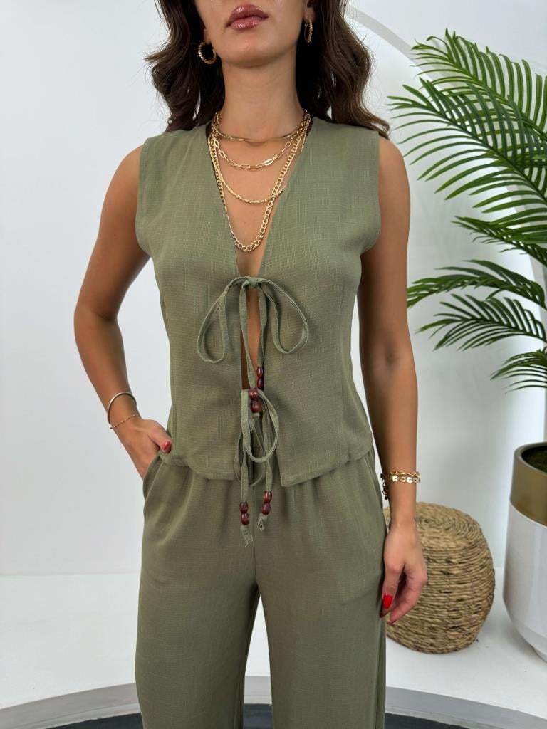 2024 fato de verão feminino sem mangas cardigan rendas colete calças soltas conjunto de duas peças feminino 1989039