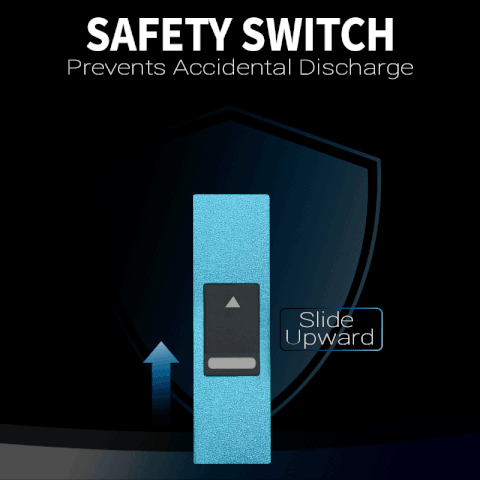 O interruptor foi projetado para evitar descarga acidental. Para ativá-lo, segure o botão branco e deslize-o para cima. Ele irá parar no topo e então a função de choque continuará gerando eletricidade.