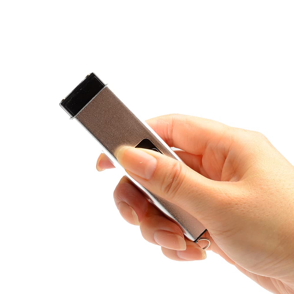 É leve e pequeno, pode ser usado em um chaveiro ou cordão e cabe facilmente no bolso ou na bolsa.