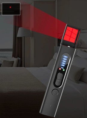 Ative o modo de pesquisa de câmera. A luz infravermelha possui 3 configurações (longa/lenta/rápida). Um visor especial integrado neste detector facilita a visualização dos reflexos da lente da câmera. Ao olhar pelo visor, a lente da câmera aparece como um ponto brilhante. O detector de câmera também possui uma lanterna para encontrar facilmente a câmera à noite!