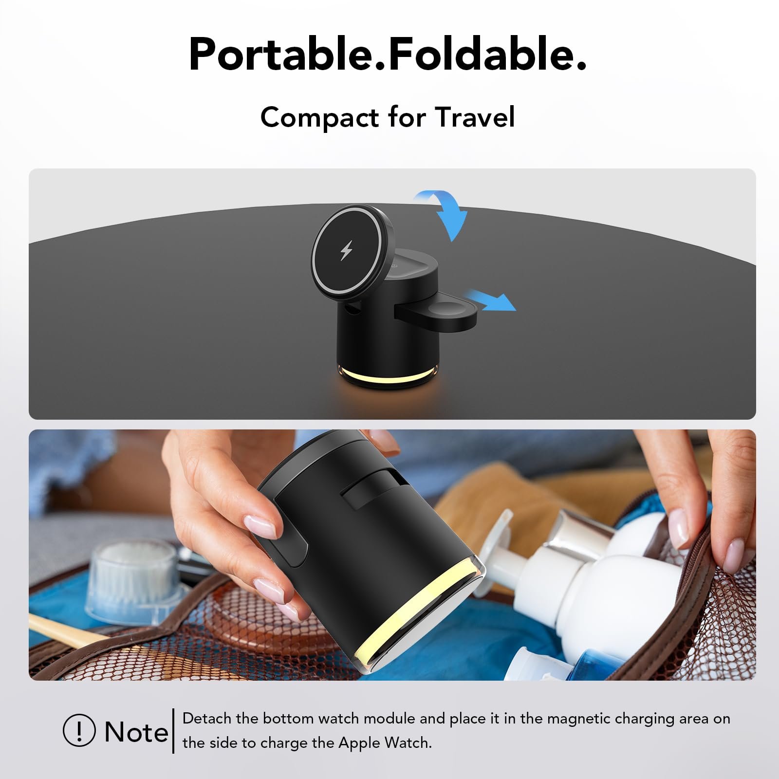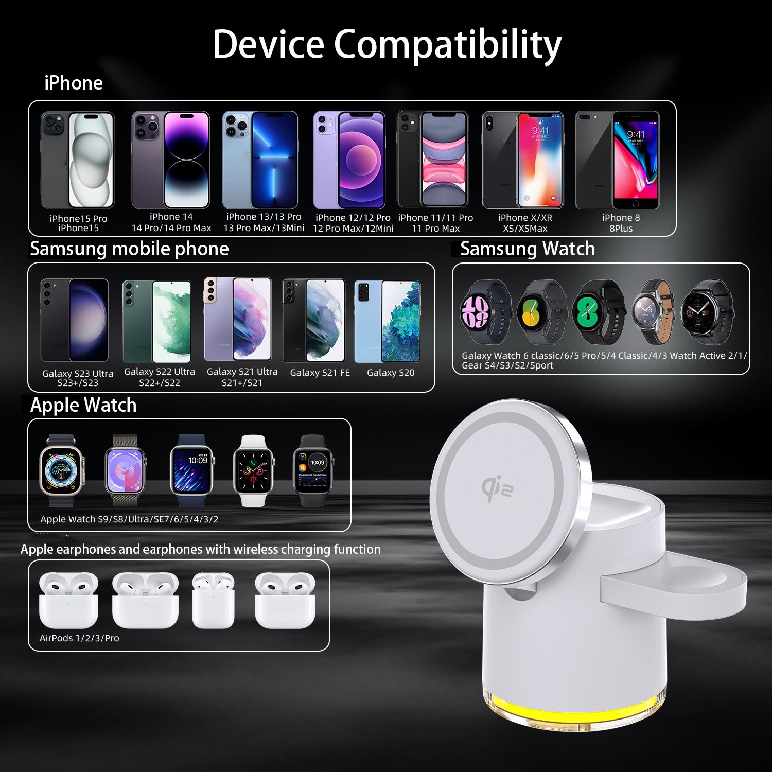 Bem-vindo para escolher nosso novo Qi2 Magnetic 3-in-1 Wireless Charger, que é especialmente projetado para a série Apple 15 e outros dispositivos. Ele combina design dobrável e função de carregamento poderosa para lhe trazer uma experiência de carregamento conveniente e eficiente. Esta estação de carregamento 3-em-1 pode carregar perfeitamente seu telefone celular, relógio e fones de ouvido ao mesmo tempo!