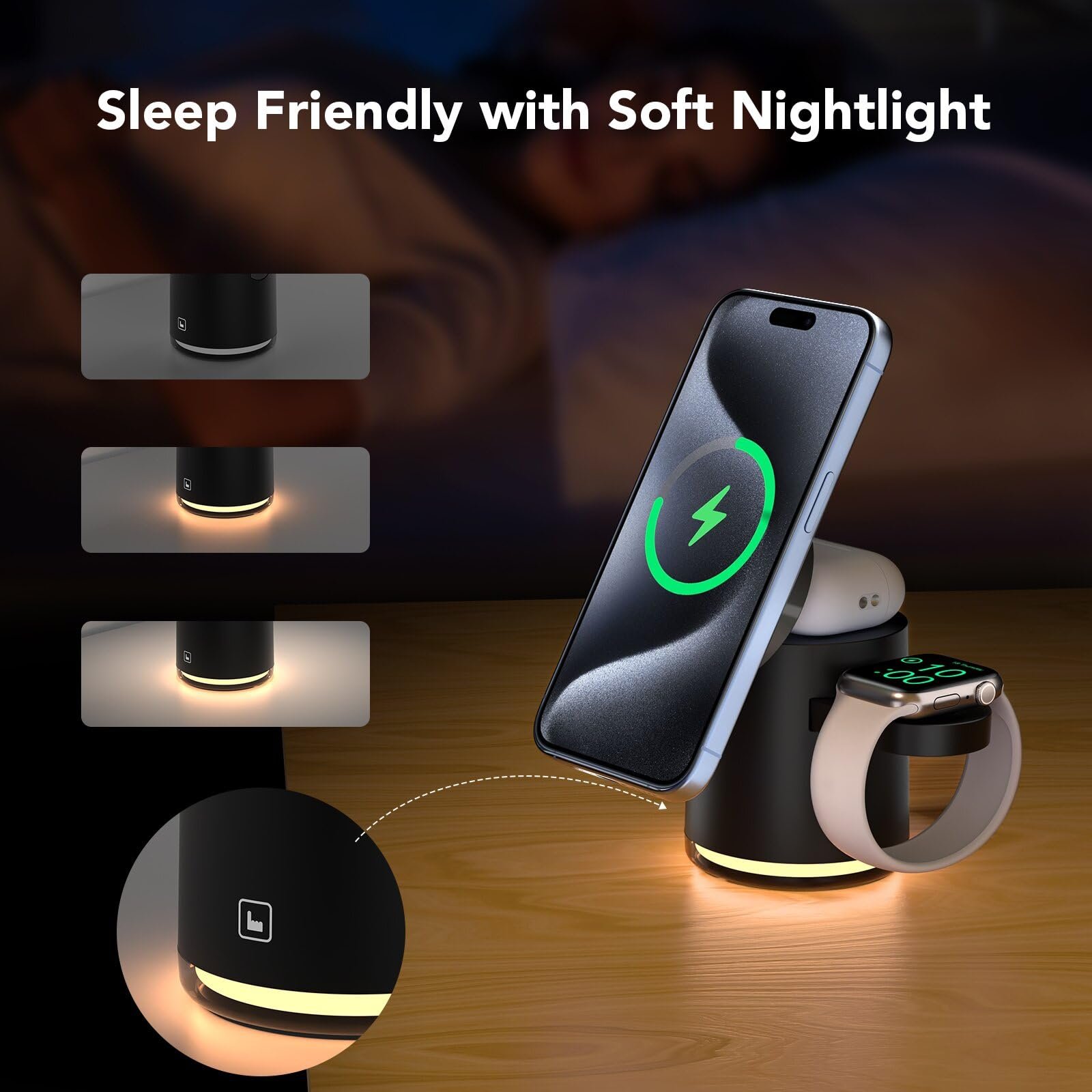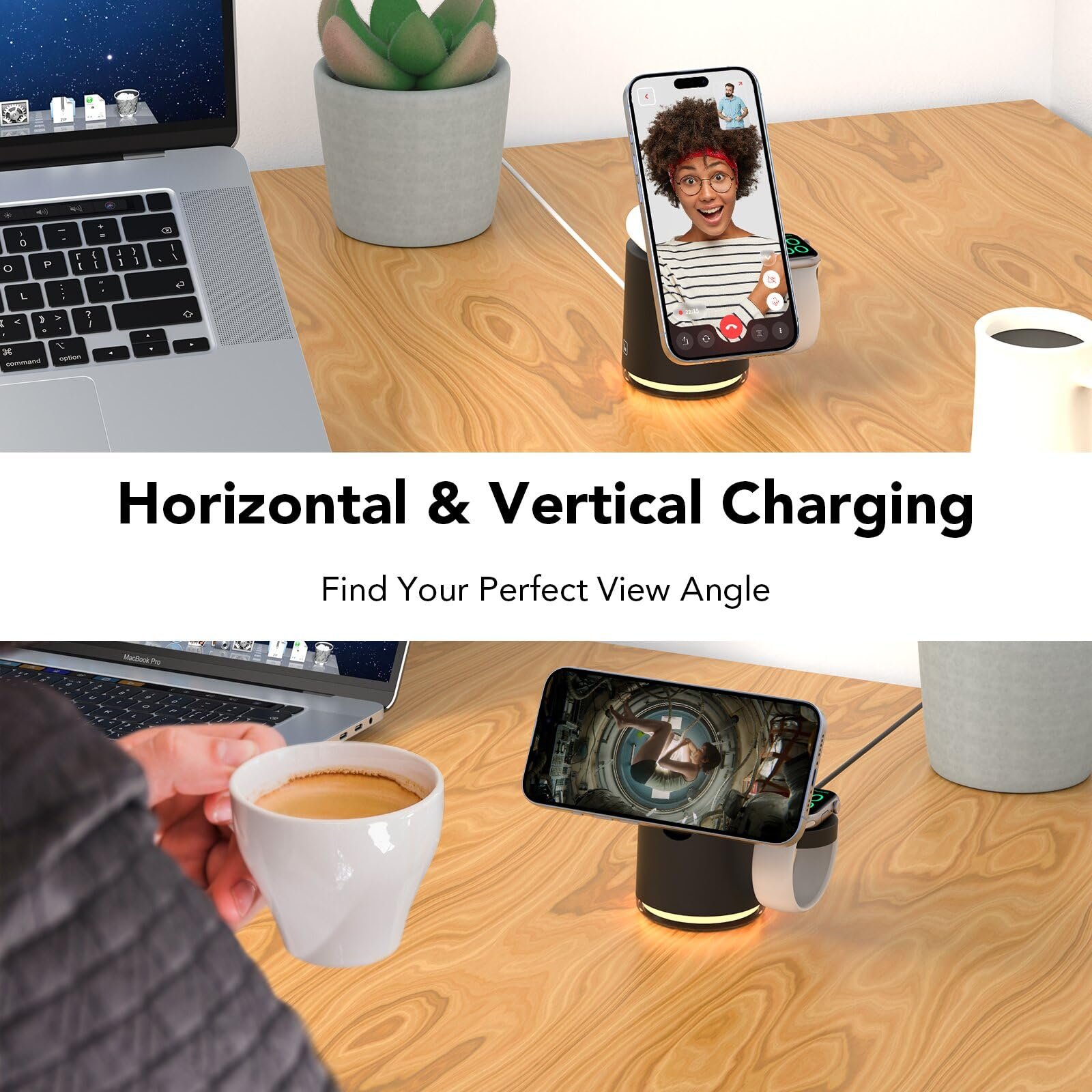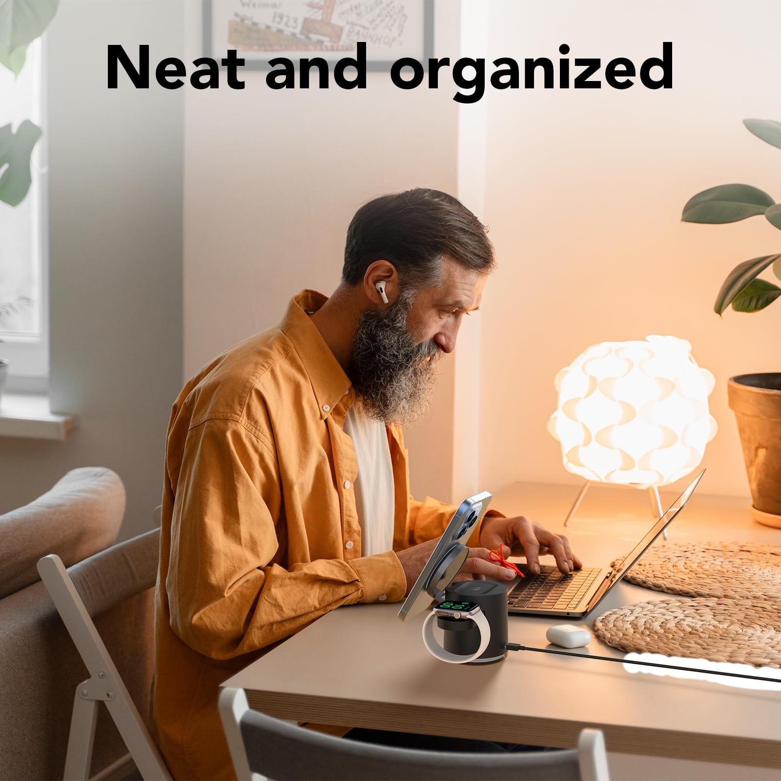 Funções de carregamento integradas para celulares, relógios e fones de ouvido. Você pode carregar simultaneamente seu celular Apple 15 com carregamento rápido sem fio magnético, carregar seu Apple Watch sem fio e carregar fones de ouvido como AirPods sem fio, deixando sua área de trabalho mais organizada e arrumada sem a necessidade de vários carregadores e cabos de carregamento bagunçados.