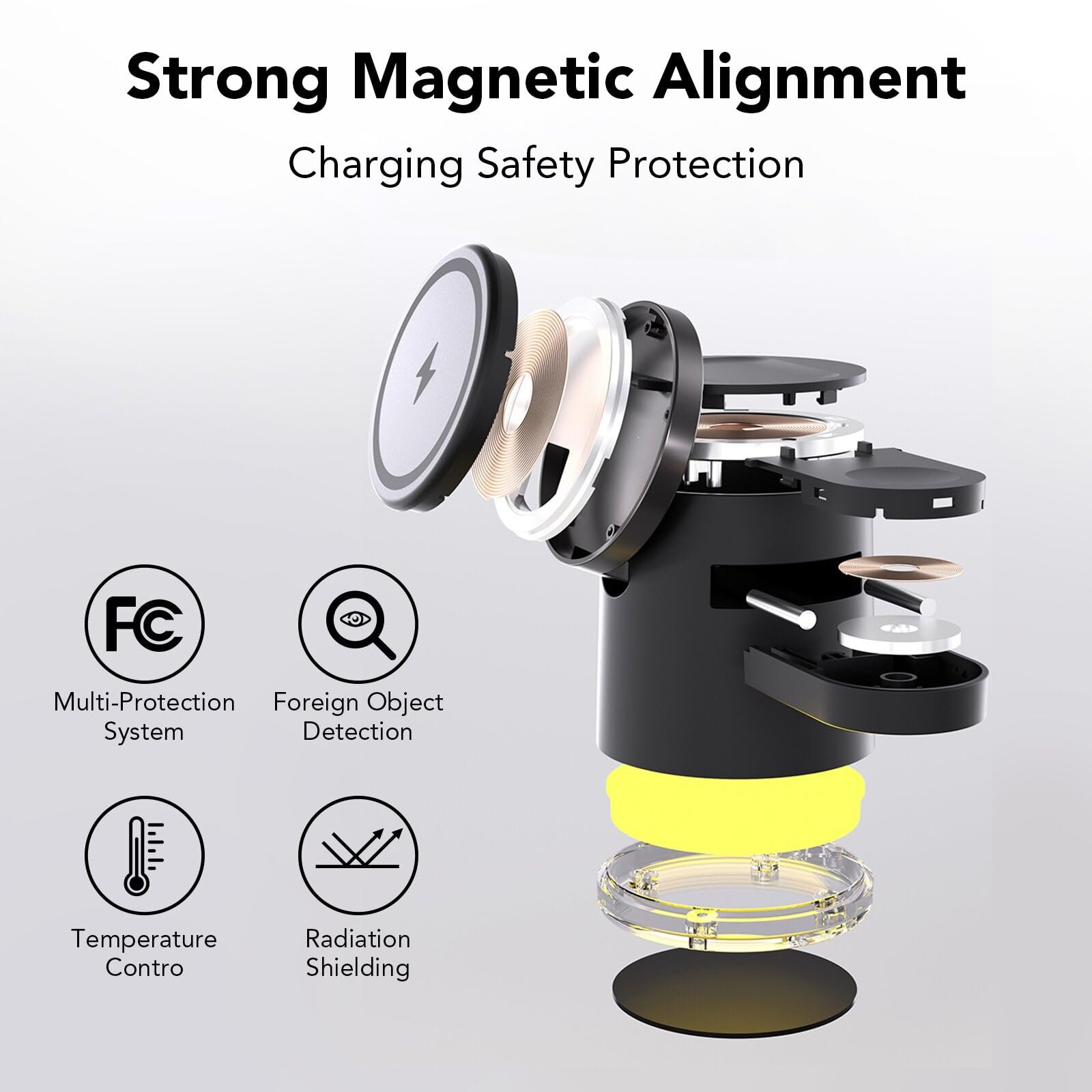 Usando o mais recente padrão de carregamento rápido magnético Qi2, ele fornece uma experiência de carregamento eficiente e rápida para telefones Apple. Comparado com o carregamento sem fio tradicional, a velocidade de carregamento é muito melhorada, permitindo que seu telefone recupere energia suficiente em um curto espaço de tempo. A poderosa função de sucção magnética garante que o telefone esteja firmemente preso durante o carregamento, e ele não se moverá facilmente, mesmo se você atender uma chamada ou operar o telefone durante o carregamento, garantindo a estabilidade e a continuidade do carregamento.